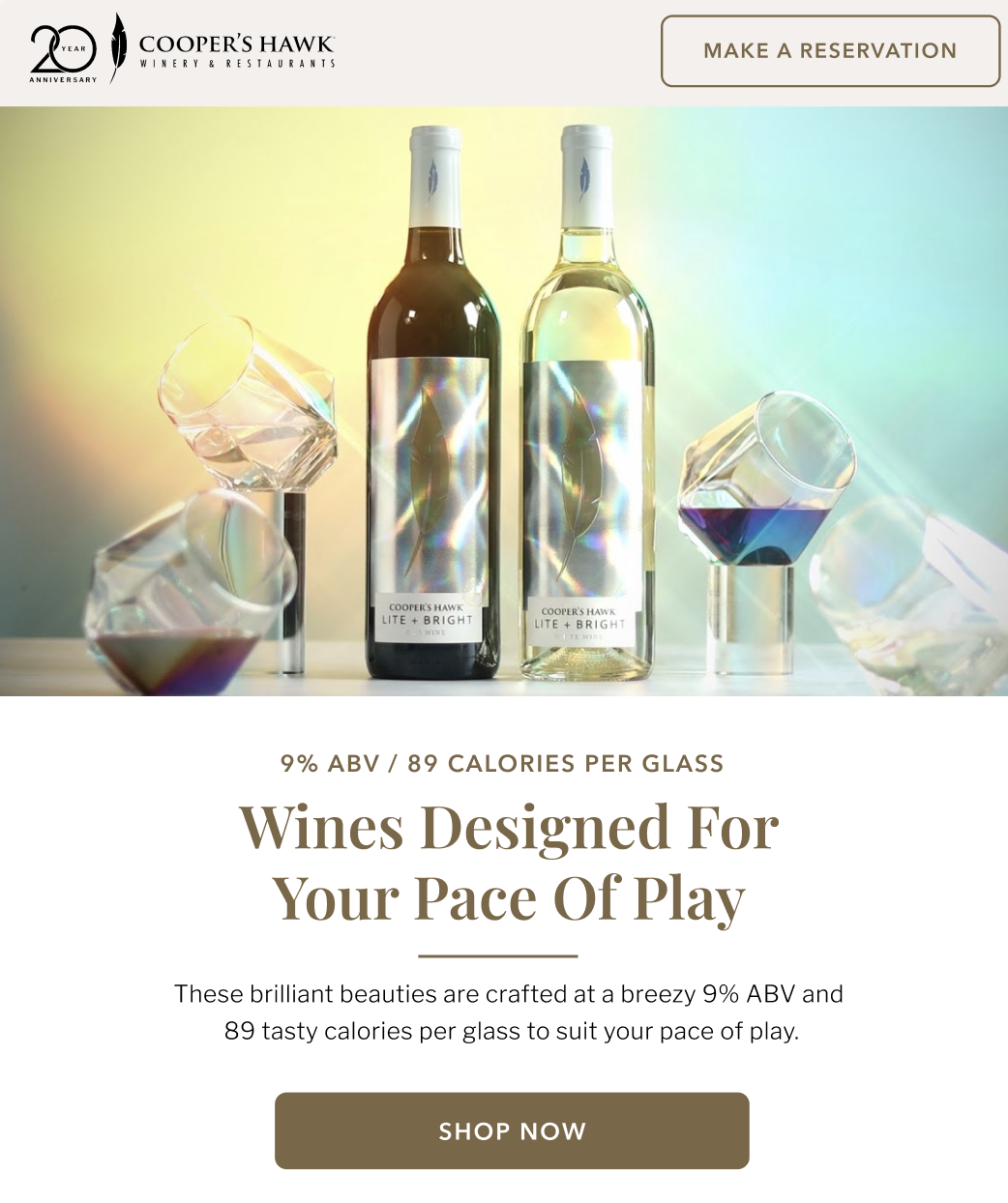 People love the Cooper's Hawk vibe and the approachability of their carefully crafted and 100% exclusive line of wines. With the biggest wine club in the world (800,000+ and counting) they're always innovating when it comes to their food, beverage, and customer experience. We were tasked with helping them shape the way they talk about their latest low / non-alcohol wine, wine-based cocktails, and wine club in ways that feel fun and real.