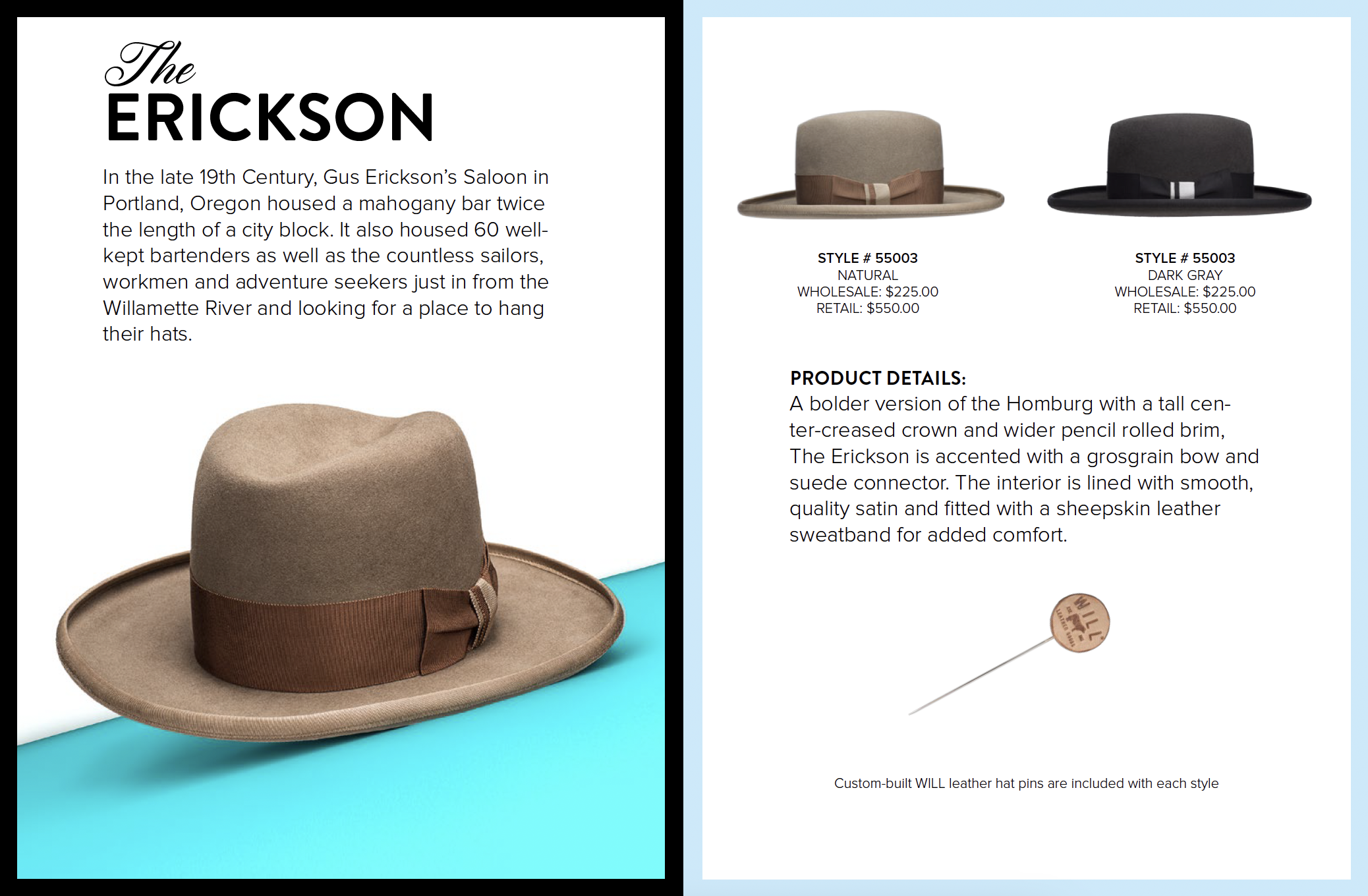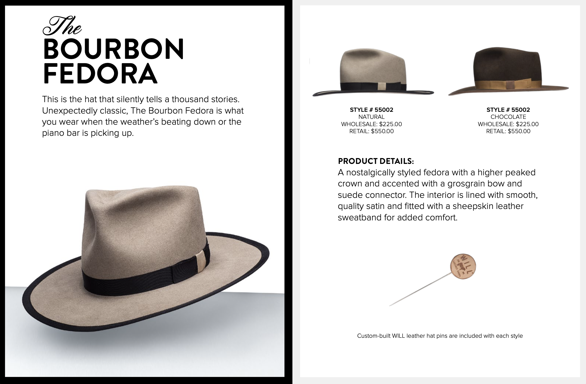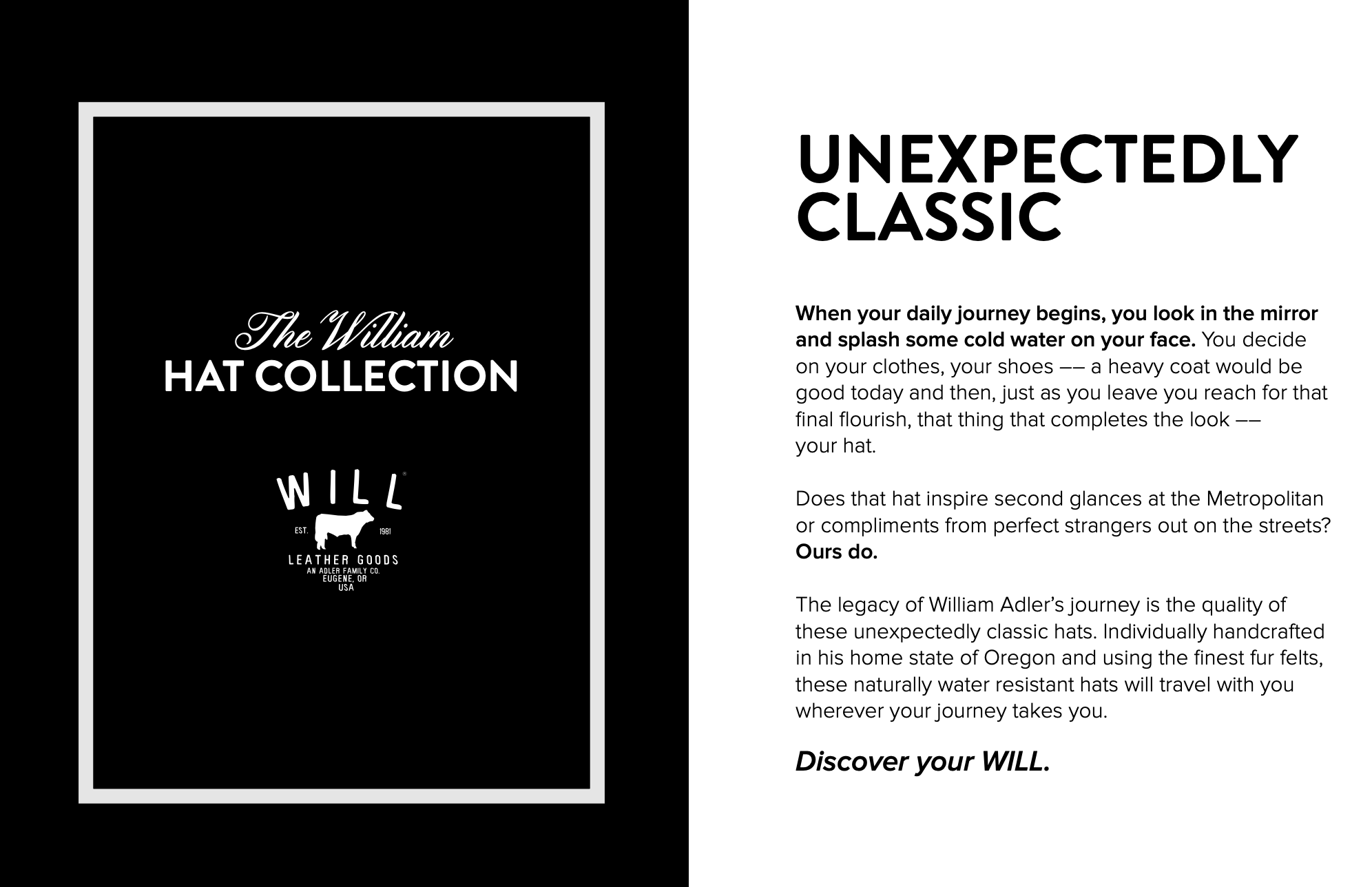 I had a chance to work closely with the CEO of WILL Leather Goods on the launch of their new line of hats — The William Hat Collection. In addition to coming up with names for every hat, I was charged with developing messaging with style and storytelling that shined a light on the brand's Oregon roots. Below are a few select pages from the lookbook.